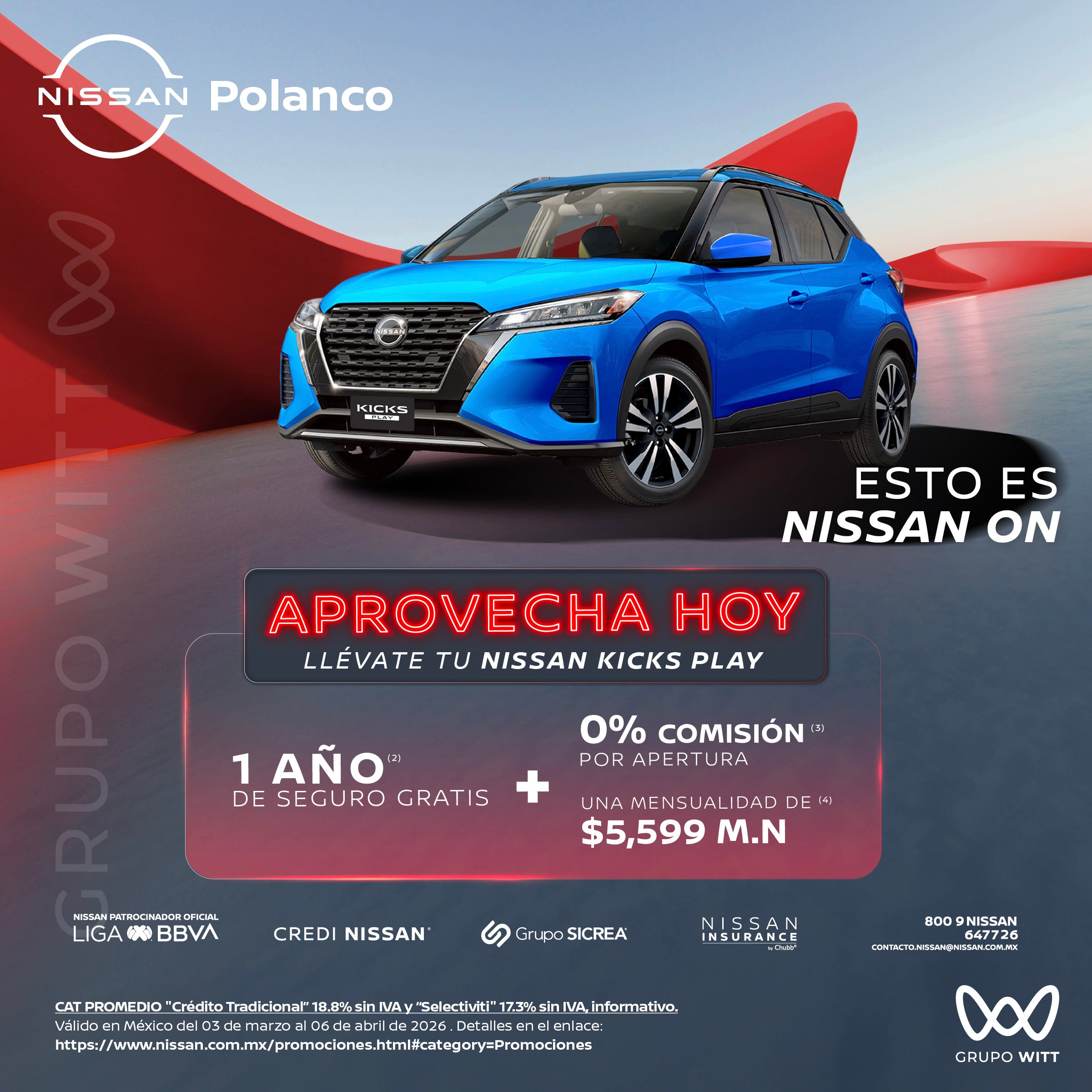 CAT PROMEDIO "Crédito Tradicional" 18.8% sin IVA y "Selectiviti" 17.3% sin IVA, informativo. Válido en México del 03 de marzo al 06 de abril de 2026. Detalles en el enlace: https://www.nissan.com.mx/promociones.html#category=Promociones
