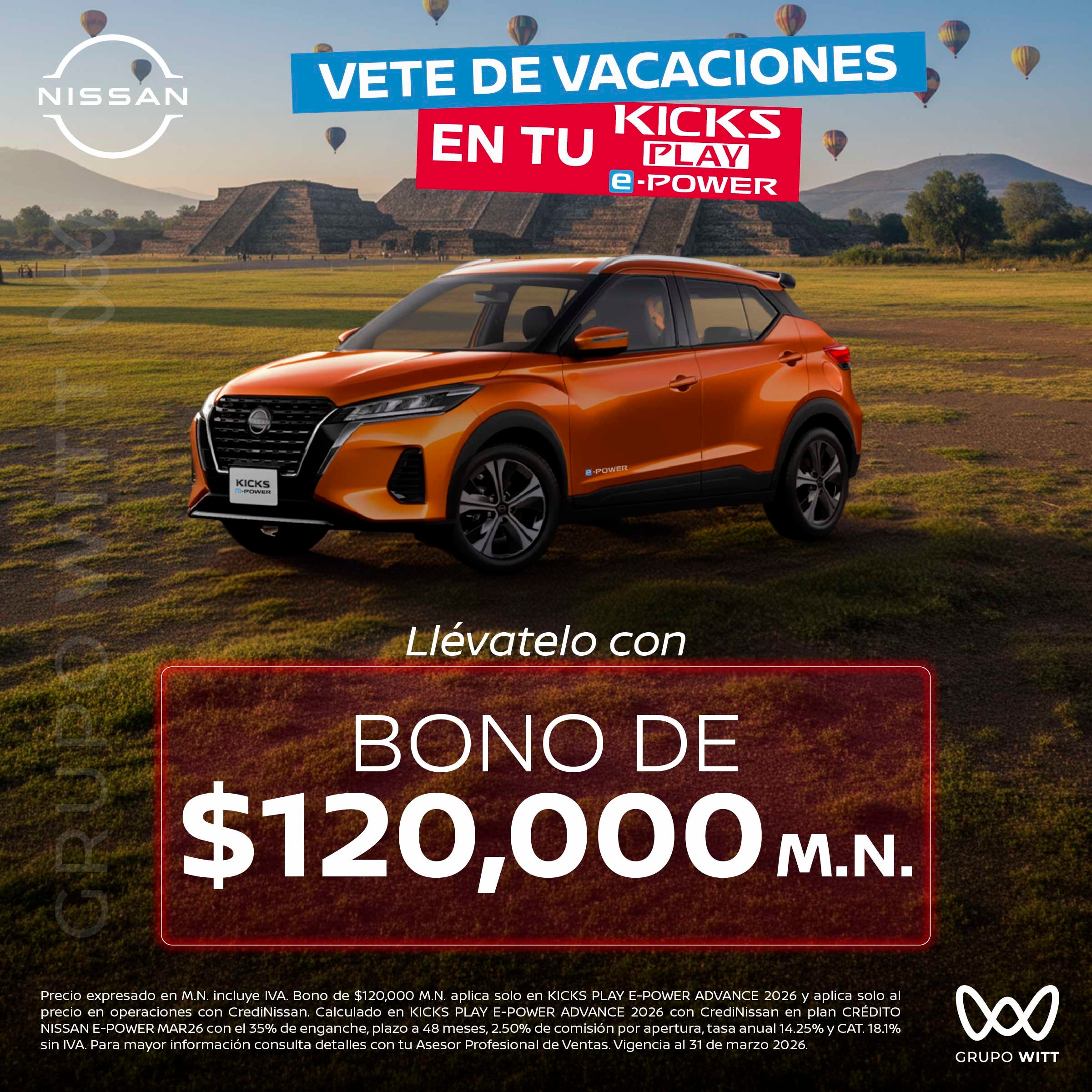 Precio expresado en M.N. incluye IVA. Bono de $120,000 M.N. aplica solo en KICKS PLAY E-POWER ADVANCE 2026 y aplica solo al precio en operaciones con CrediNissan. Calculado en KICKS PLAY E-POWER ADVANCE 2026 con CrediNissan en plan CRÉDITO NISSAN E-POWER MAR26 con el 35% de enganche, plazo a 48 meses, 2.50% de comisión por apertura, tasa anual 14.25% y CAT. 18.1% sin IVA. Para mayor información consulta detalles con tu Asesor Profesional de Ventas. Vigencia al 31 de marzo 2026.