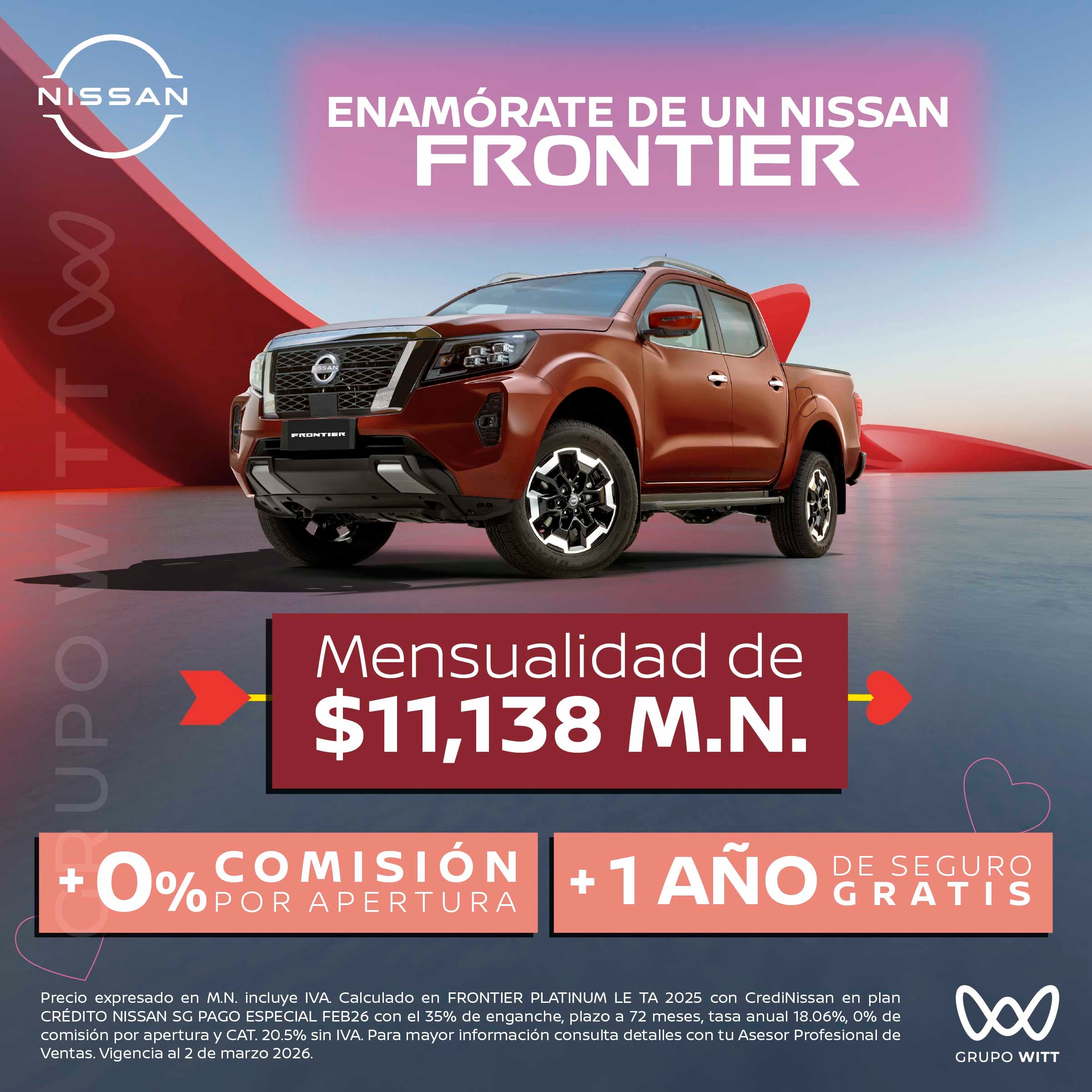 Precio expresado en M.N. incluye IVA. Calculado en FRONTIER PLATINUM LE TA 2025 con CrediNissan en plan CRÉDITO NISSAN SG PAGO ESPECIAL FEB26 con el 35% de enganche, plazo a 72 meses, tasa anual 18.06%, 0% de comisión por apertura y CAT. 20.5% sin IVA. Para mayor información consulta detalles con tu Asesor Profesional de Ventas. Vigencia al 2 de marzo 2026.