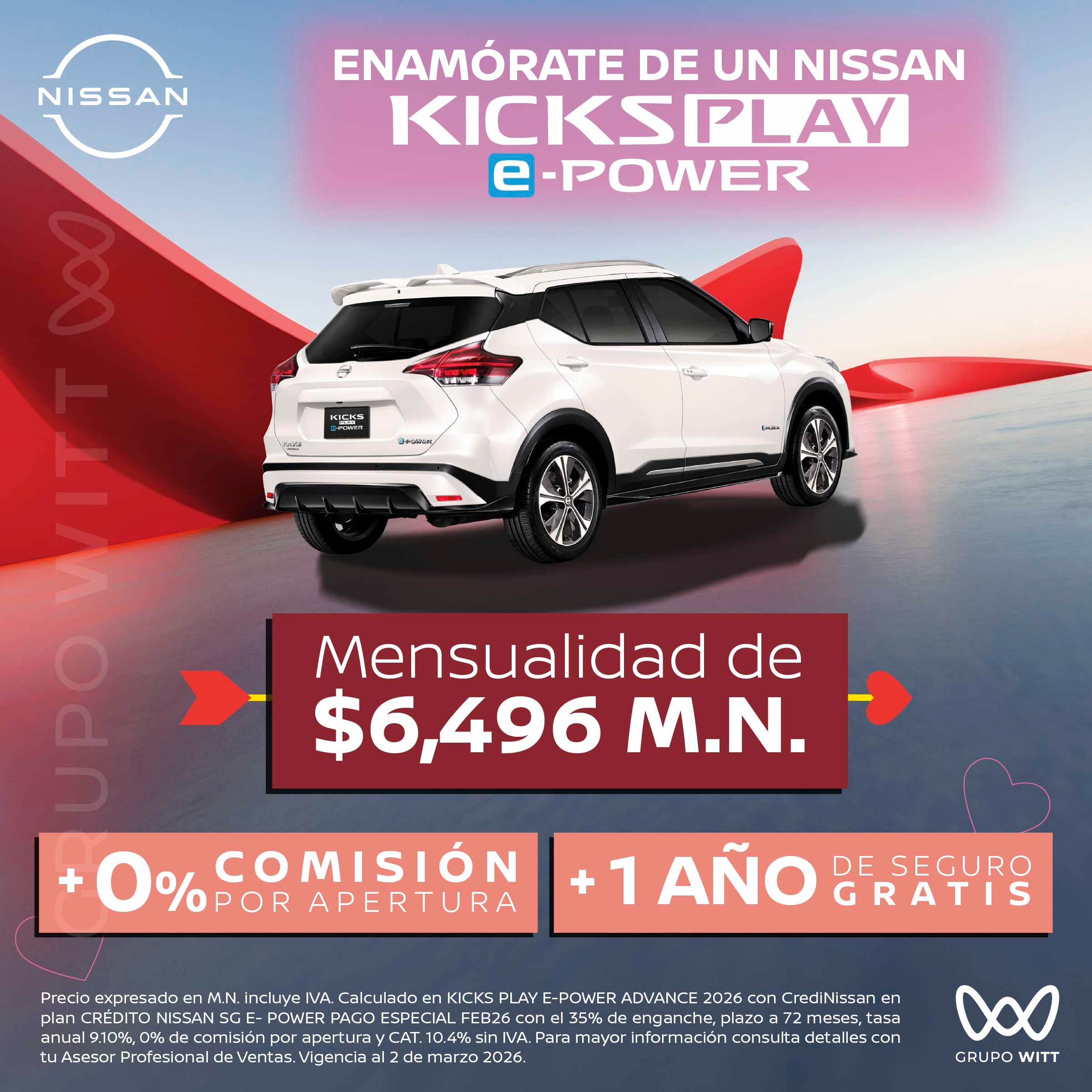 Precio expresado en M.N. incluye IVA. Calculado en KICKS PLAY E-POWER ADVANCE 2026 con CrediNissan en plan CRÉDITO NISSAN SG E-POWER PAGO ESPECIAL FEB26 con el 35% de enganche, plazo a 72 meses, tasa anual 9.10%, 0% de comisión por apertura y CAT. 10.4% sin IVA. Para mayor información consulta detalles con tu Asesor Profesional de Ventas. Vigencia al 2 de marzo 2026.
