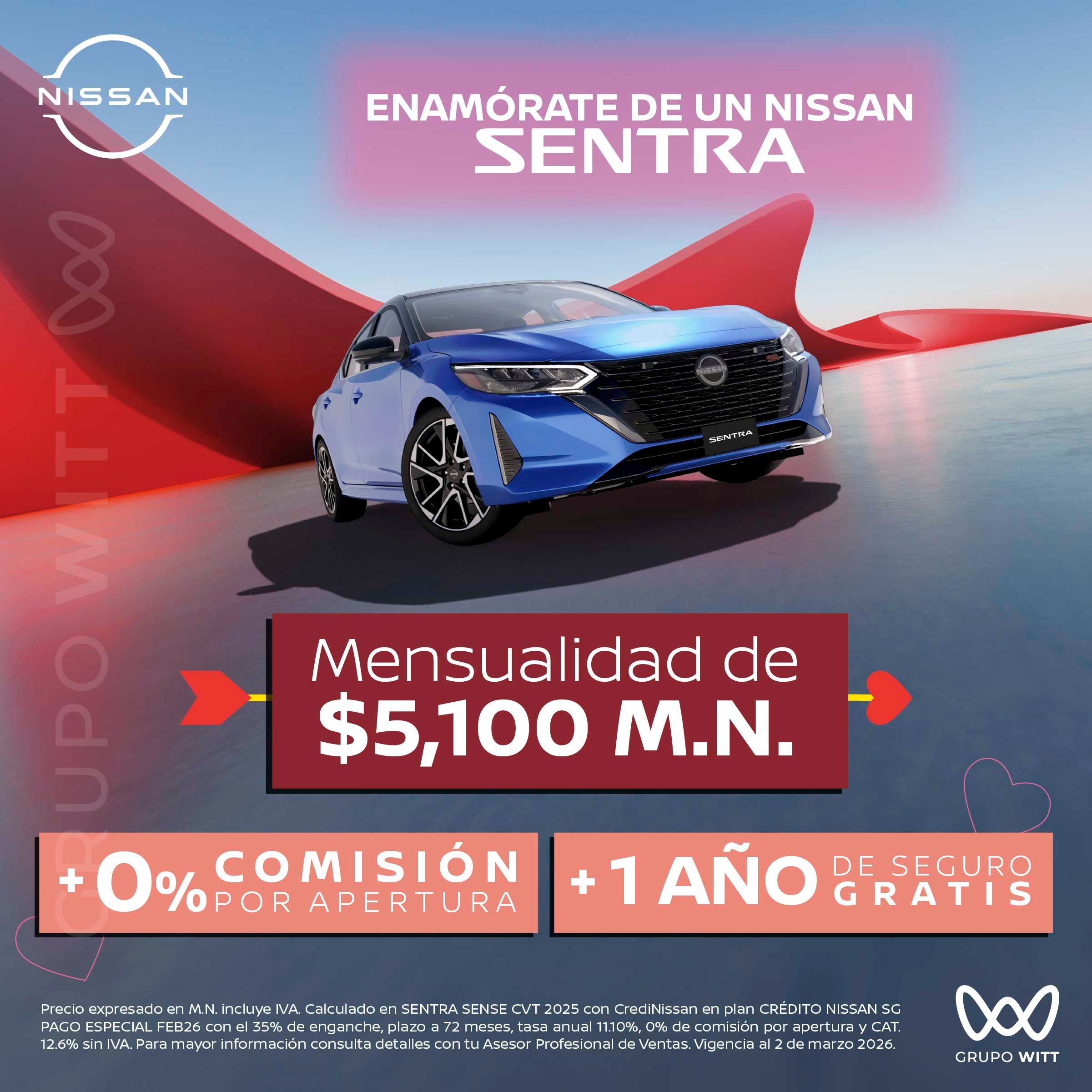 Precio expresado en M.N. incluye IVA. Calculado en SENTRA SENSE CVT 2025 con CrediNissan en plan CRÉDITO NISSAN SG PAGO ESPECIAL FEB26 con el 35% de enganche, plazo a 72 meses, tasa anual 11.10%, 0% de comisión por apertura y CAT. 12.6% sin IVA. Para mayor información consulta detalles con tu Asesor Profesional de Ventas. Vigencia al 2 de marzo 2026.