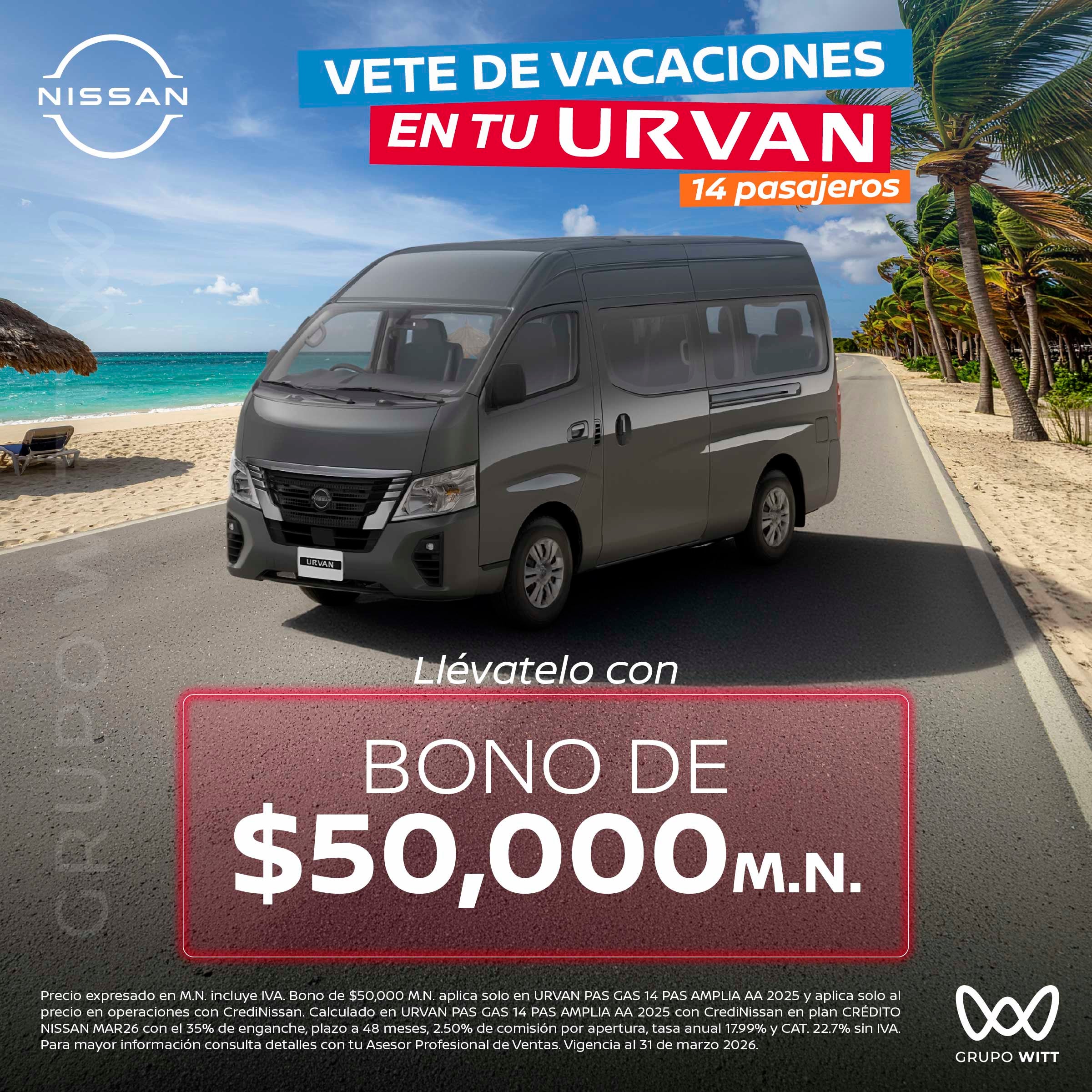 Precio expresado en M.N. incluye IVA. Bono de $50,000 M.N. aplica solo en URVAN PAS GAS 14 PAS AMPLIA AA 2025 y aplica solo al precio en operaciones con CrediNissan. Calculado en URVAN PAS GAS 14 PAS AMPLIA AA 2025 con CrediNissan en plan CRÉDITO NISSAN MAR26 con el 35% de enganche, plazo a 48 meses, 2.50% de comisión por apertura, tasa anual 17.99% y CAT. 22.7% sin IVA. Para mayor información consulta detalles con tu Asesor Profesional de Ventas. Vigencia al 31 de marzo 2026.