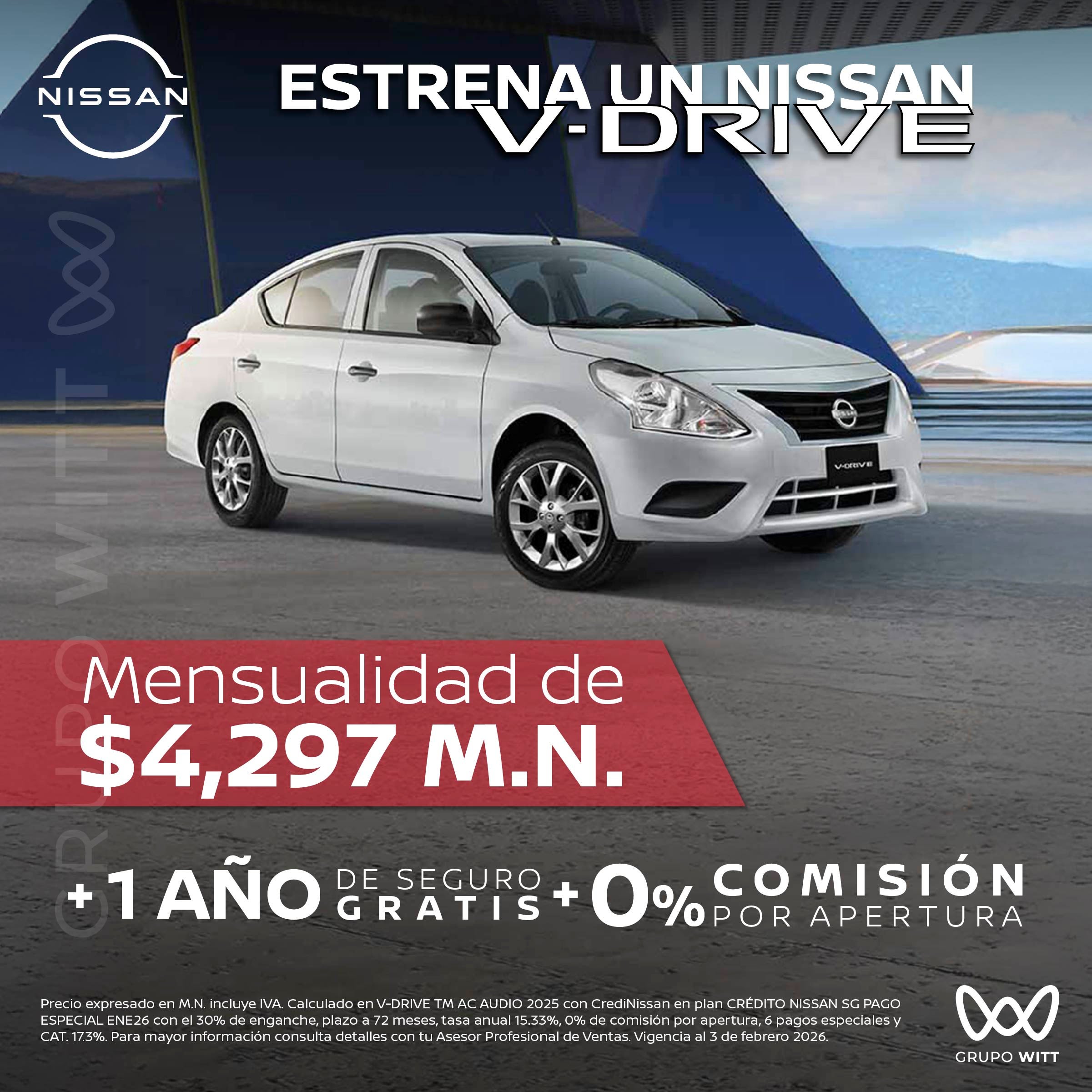 Precio expresado en M.N. incluye IVA. Calculado en V-DRIVE TM AC AUDIO 2025 con CrediNissan en plan CRÉDITO NISSAN SG PAGO ESPECIAL ENE26 con el 30% de enganche, plazo a 72 meses, tasa anual 15.33%, 0% de comisión por apertura, 6 pagos especiales y CAT. 17.3%. Para mayor información consulta detalles con tu Asesor Profesional de Ventas. Vigencia al 3 de febrero 2026.