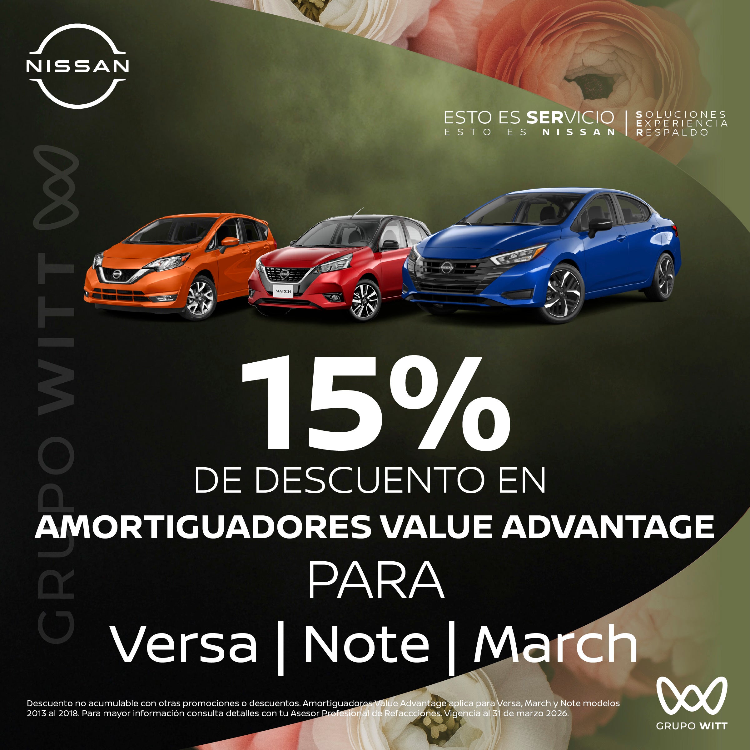 Descuento no acumulable con otras promociones o descuentos. Amortiguadores Value Advantage aplica para Versa, March y Note modelos 2013 al 2018. Para mayor información consulta detalles con tu Asesor Profesional de Refacciones. Vigencia al 31 de marzo 2026.