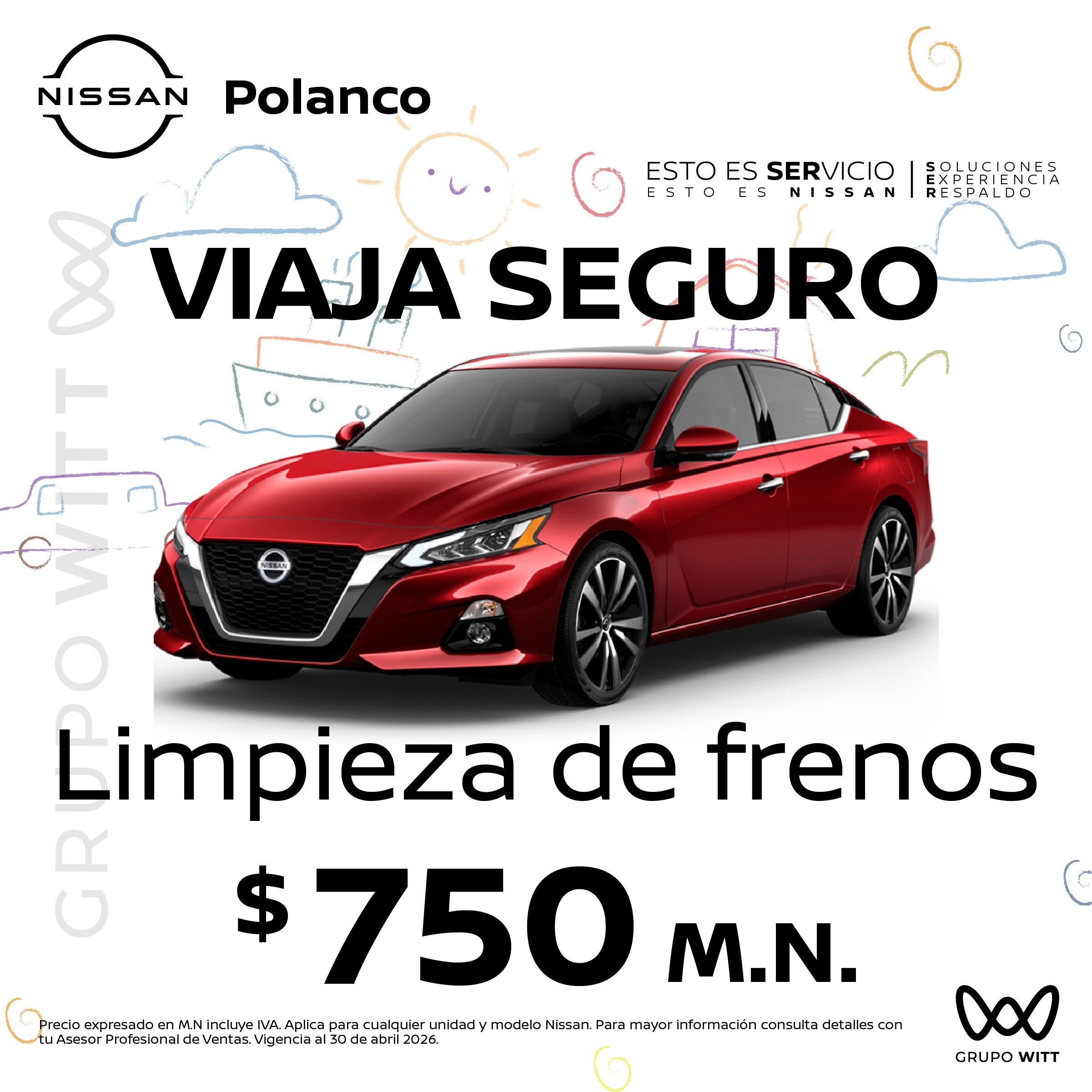 Precio expresado en M.N incluye IVA. Aplica para cualquier unidad y modelo Nissan. Para mayor información consulta detalles con tu Asesor Profesional de Ventas. Vigencia al 30 de abril 2026.