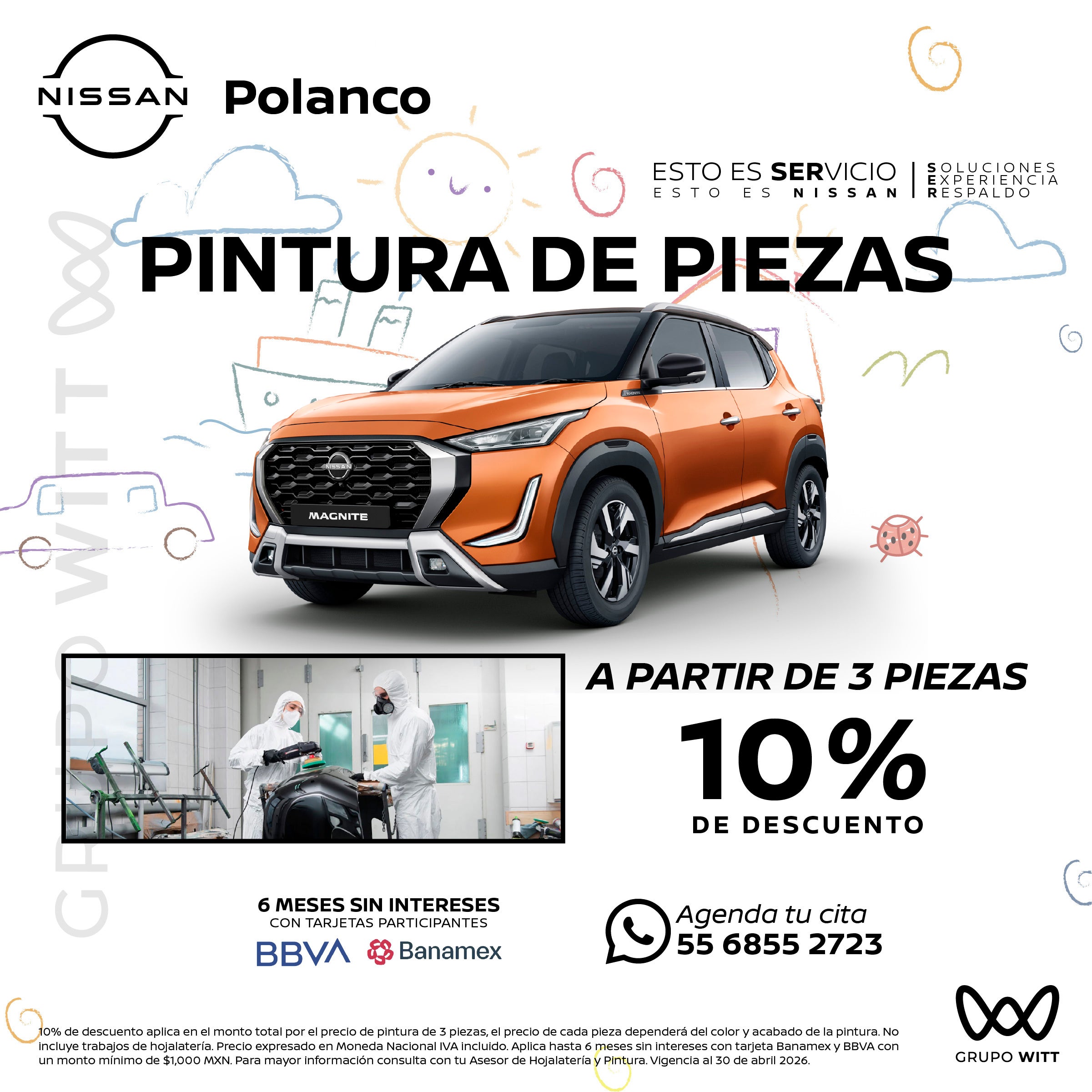 10% de descuento aplica en el monto total por el precio de pintura de 3 piezas, el precio de cada pieza dependerá del color y acabado de la pintura. No incluye trabajos de hojalatería. Precio expresado en Moneda Nacional IVA incluido. Aplica hasta 6 meses sin intereses con tarjeta Banamex y BBVA con un monto mínimo de $1,000 MXN. Para mayor información consulta con tu Asesor de Hojalatería y Pintura. Vigencia al 30 de abril 2026.