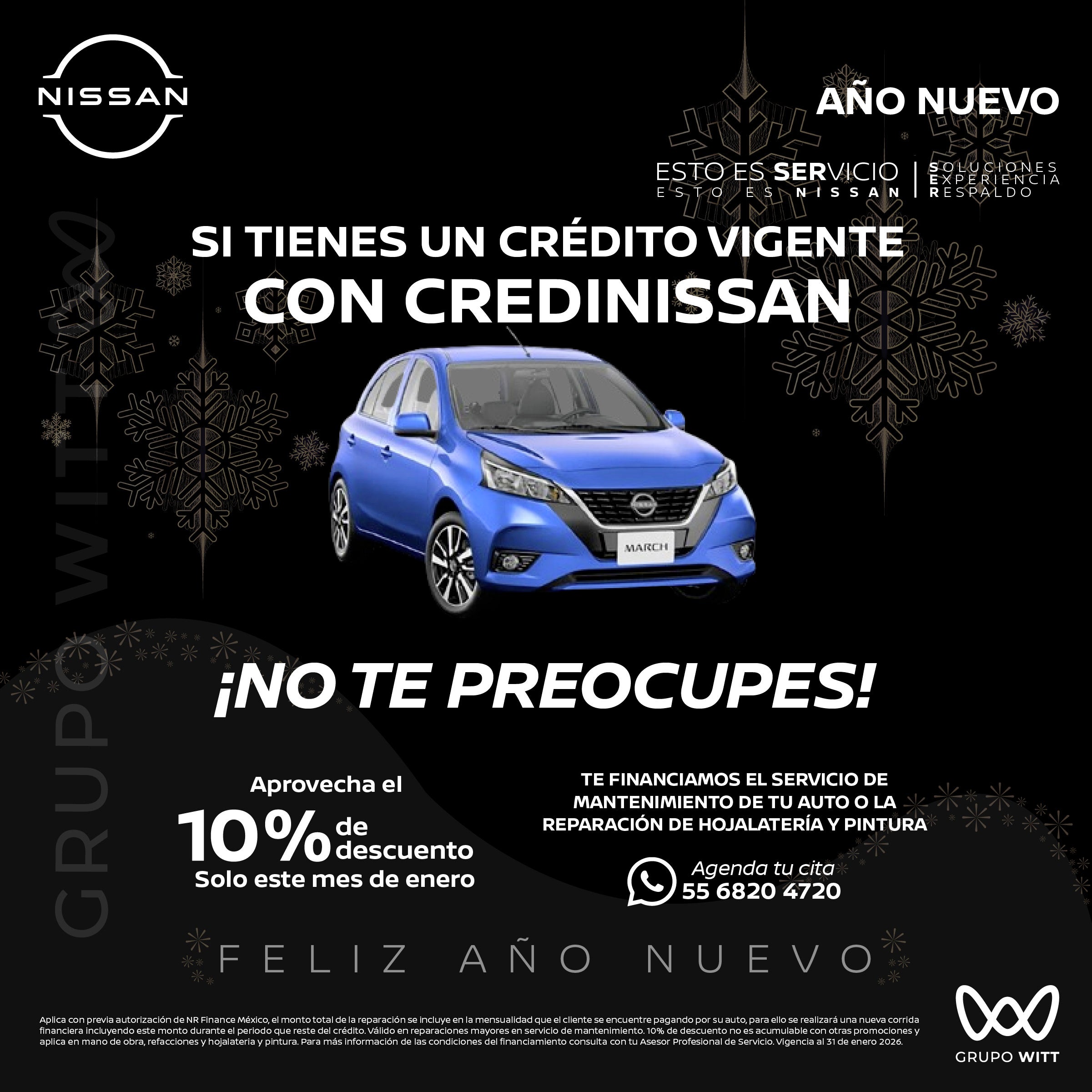 Aplica con previa autorización de NR Finance México, el monto total de la reparación se incluye en la mensualidad que el cliente se encuentre pagando por su auto, para ello se realizara una nueva corrida financiera incluyendo este monto durante el periodo que reste del crédito. Válido en reparaciones mayores en servicio de mantenimiento. 10% de descuento no es acumulable con otras promociones y aplica en mano de obra refacciones y hojalatería y pintura para más información de las condiciones del financiamiento consulta con tu Asesor Profesional de Servicio. Vigencia al 31 de enero 2026.
