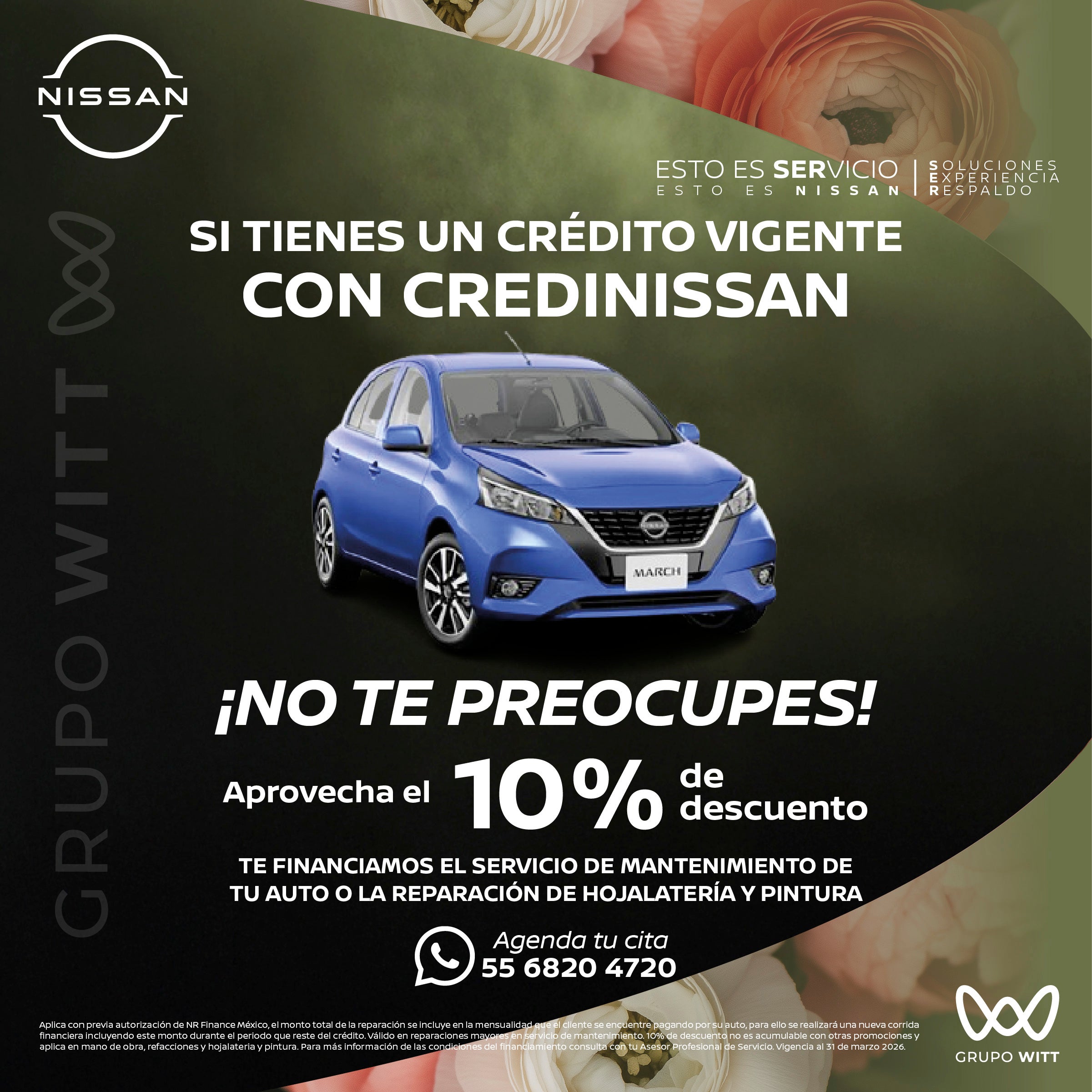 Aplica con previa autorización de NR Finance México, el monto total de la reparación se Incluye en la mensualidad que el cliente se encuentre pagando por su auto, para ello se realizara una nueva corrida financiera incluyendo este monto durante el período que reste del crédito. Válido en reparaciones mayores en servicio de mantenimiento. 10% de descuento no es acumulable con otras promociones y aplica en mano de obra, refacciones y hojalatería y pintura. Para más Información de las condiciones del financiamiento consulta con tu Asesor Profesional de Servicio. Vigencia a 31 de marzo 2026.