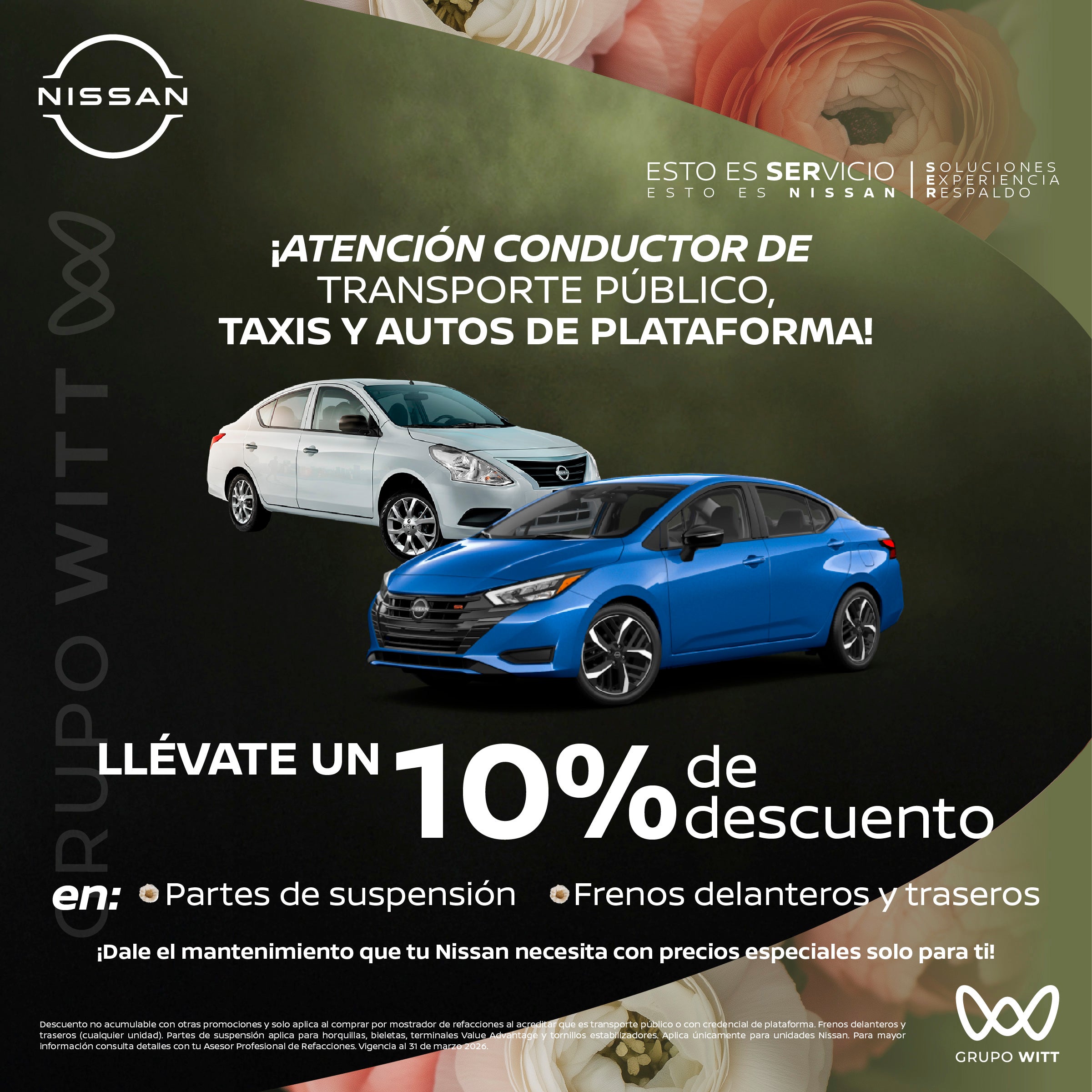 Descuento no acumulable con otras promociones y solo aplica al comprar por mostrador de refacciones al acreditar que es transporte público o con credencial de plataforma. Frenos delanteros y traseros (cualquier unidad). Partes de suspensión aplica para horquillas, bieletas, terminales Value Advantage y tornillos estabilizadores. Aplica únicamente para unidades Nissan. Para mayor Información consulta detalles con tu Asesor Profesional de Refacciones. Vigencia al 31 de marzo 2026.
