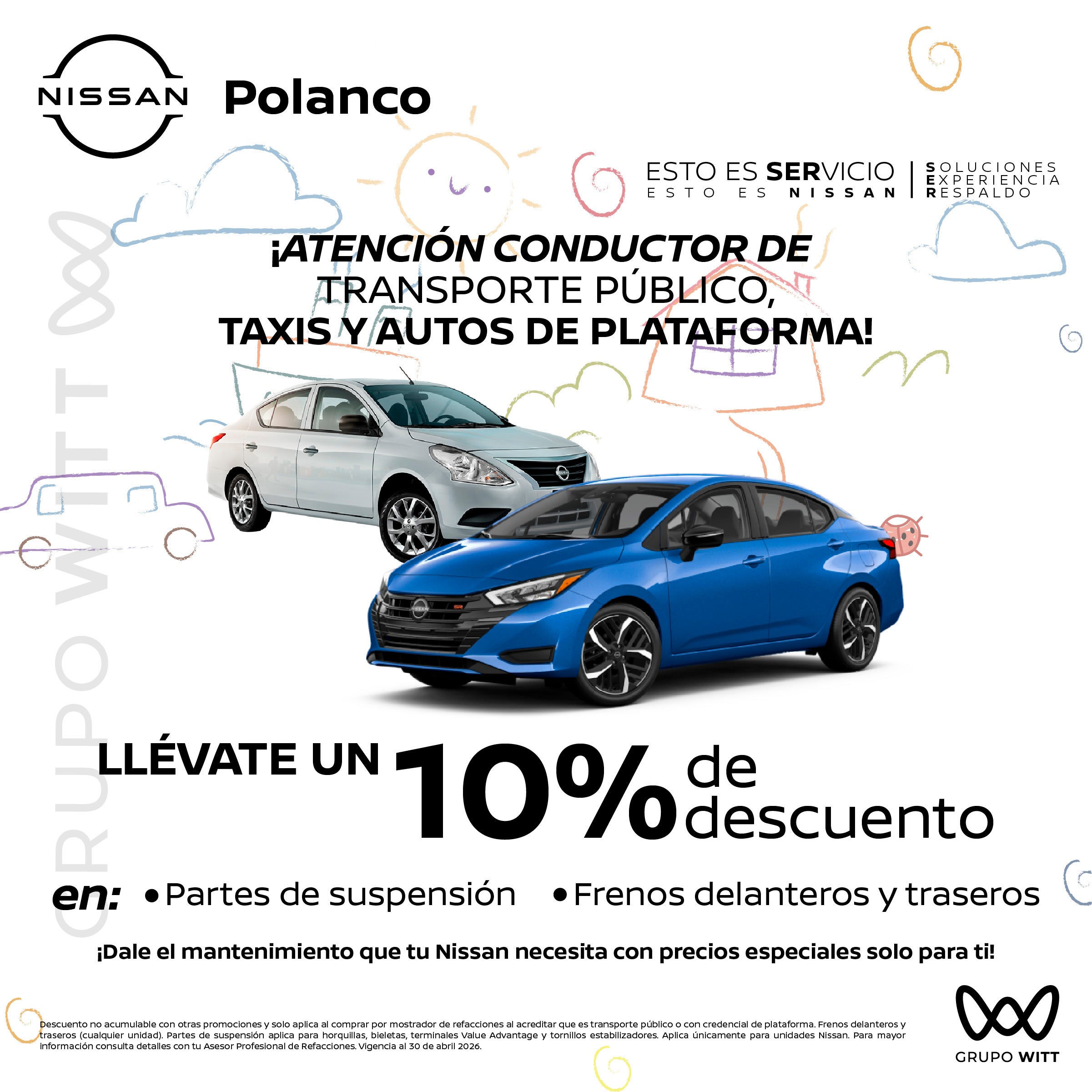 Descuento no acumulable con otras promoclones y solo aplica al comprar por mostrador de refacciones al acreditar que es transporte publico o con credenclal de plataforma. Frenos delanteros ytraseros (cualquler unidad). Partes de suspension apiica para horquillas, bleletas, terminales Value Advantage y tornlllos estabilizadores. Aplica unicamente para unidades Nissan. Para mayor Información consulta detalles con tu Asesor Profeslonal de Refacciones. Vigencla al 30 de abrii 2026.