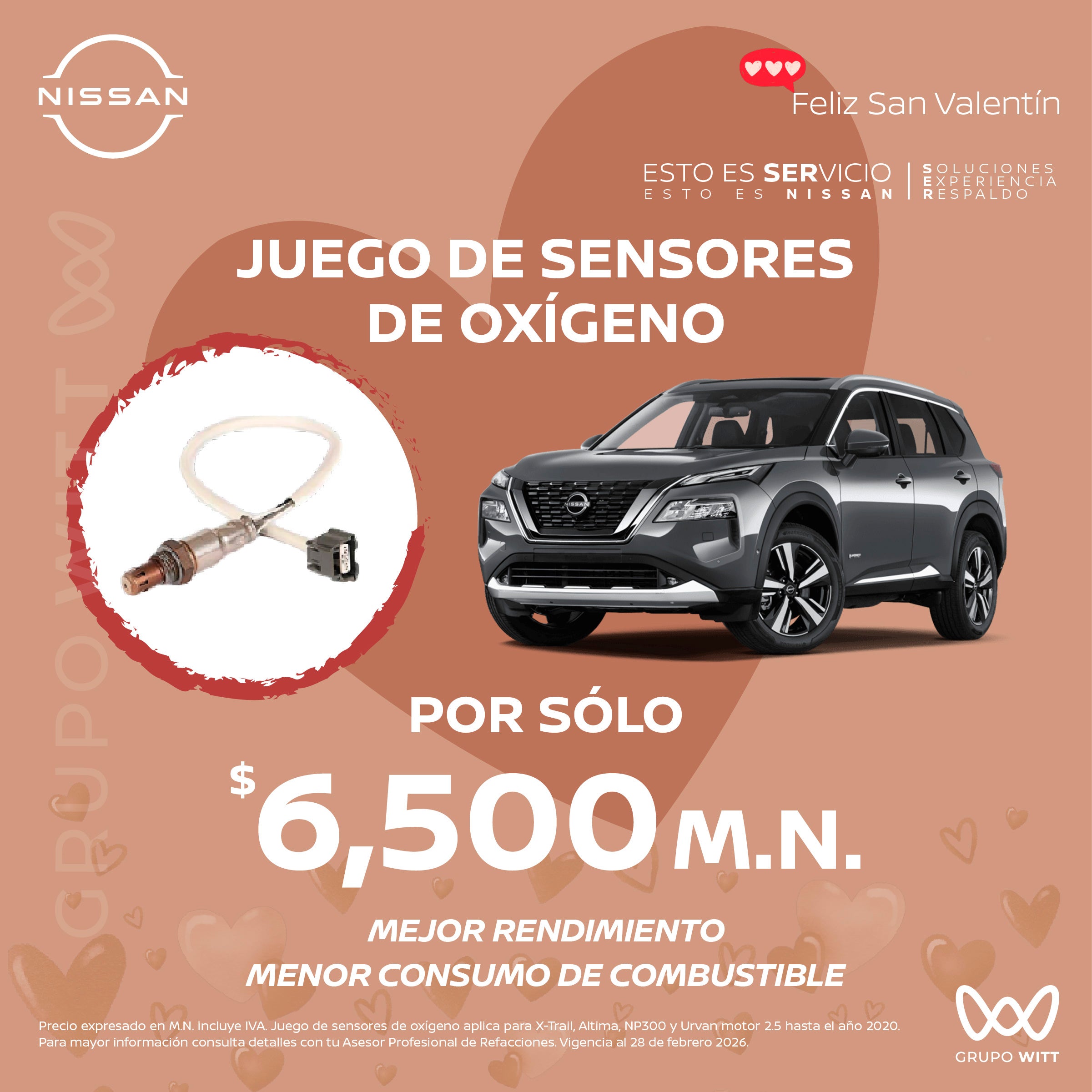 Precio expresado en M.N. incluye IVA. Juego de sensores de oxígeno aplica para X-Trail, Altima, NP300 y Urvan motor 2.5 hasta el año 2020. Para mayor información consulta detalles con tu Asesor Profesional de Refacciones. Vigencia al 28 de febrero 2026.