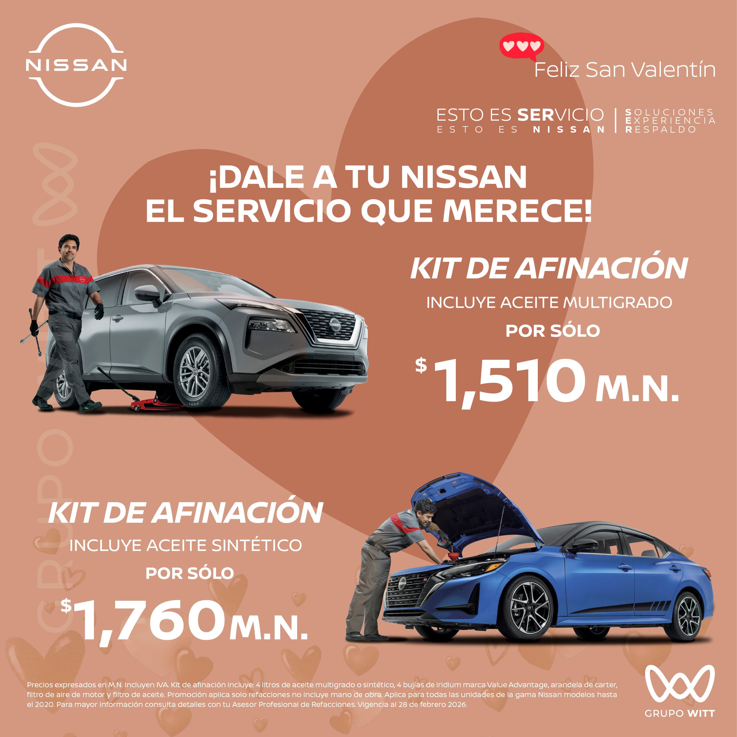 Precios expresados en M.N. Incluyen IVA. Kit de afinación incluye: 4 litros de aceite multigrado o sintético, 4 bujías de iridium marca Value Advantage, arandela de carter, filtro de aire de motor y filtro de aceite. Promoción aplica solo refacciones no incluye mano de obra. Aplica para todas las unidades de la gama Nissan modelos hasta el 2020. Para mayor información consulta detalles con tu Asesor Profesional de Refacciones. Vigencia al 28 de febrero 2026.