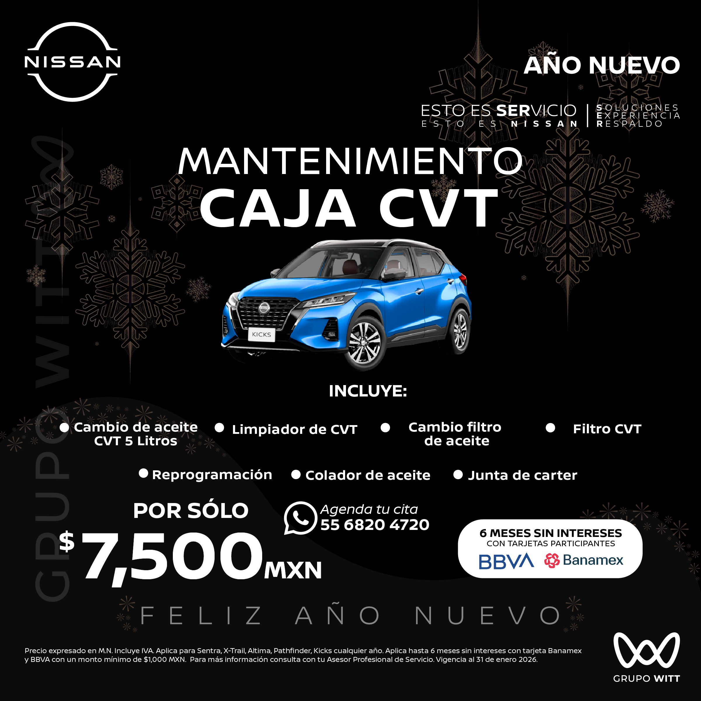 Precio expresado en M.N. Incluye IVA. Aplica para Sentra, X-Trail, Altima, Pathfinder, Kicks cualquier año. Aplica hasta 6 meses sin intereses con tarjeta Banamex y BBVA con un monto mínimo de $1,000 MXN. Para más información consulta con tu Asesor Profesional de Servicio. Vigencia al 31 de enero 2026.