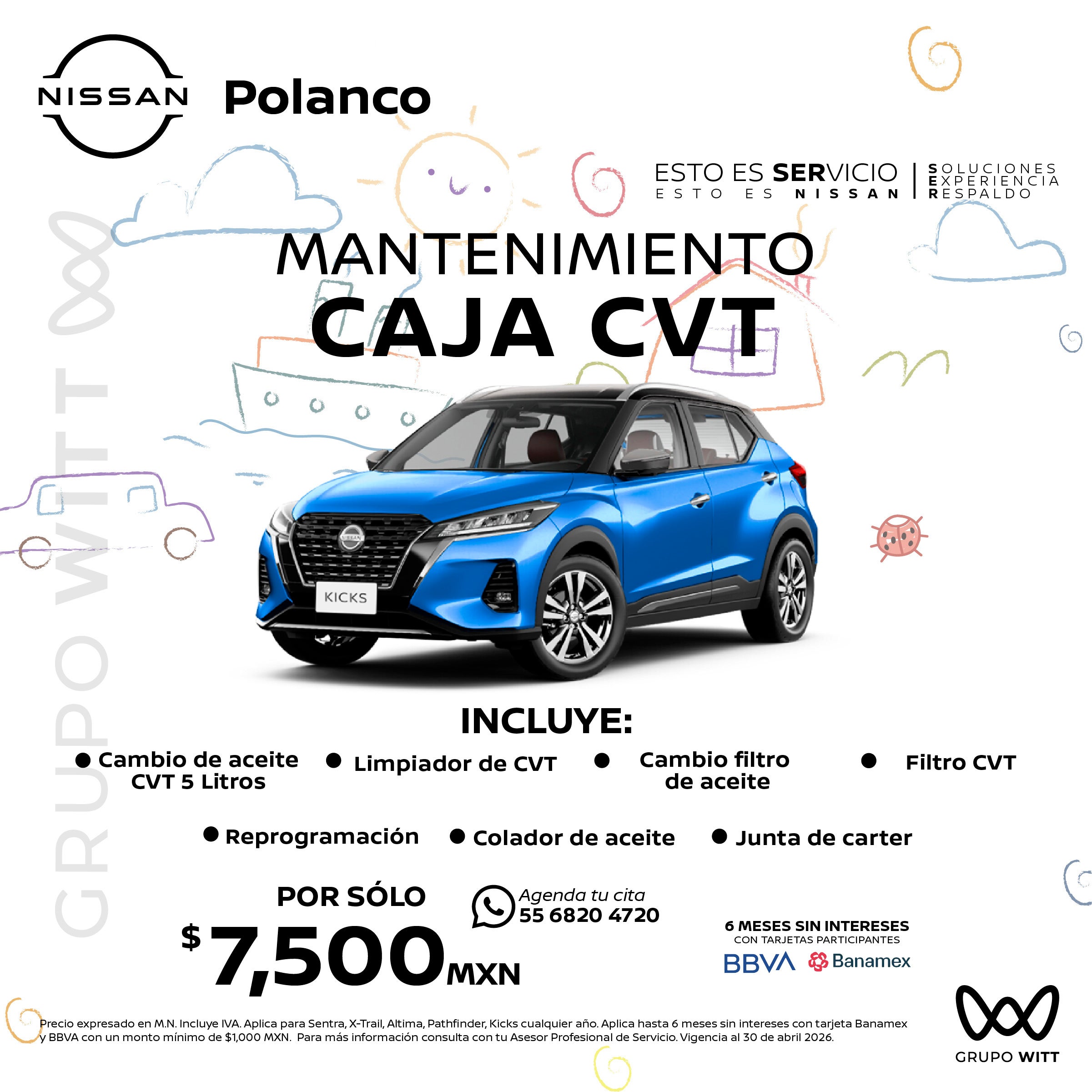 Precio expresado en M.N. Incluye IVA. Aplica para Sentra, X-Trail, Altima, Pathfinder, Kicks cualquier año. Aplica hasta 6 meses sin intereses con tarjeta Banamex y BBVA con un monto mínimo de $1,000 MXN. Para más información consulta con tu Asesor Profesional de Servicio. Vigencia al 30 de abril 2026.