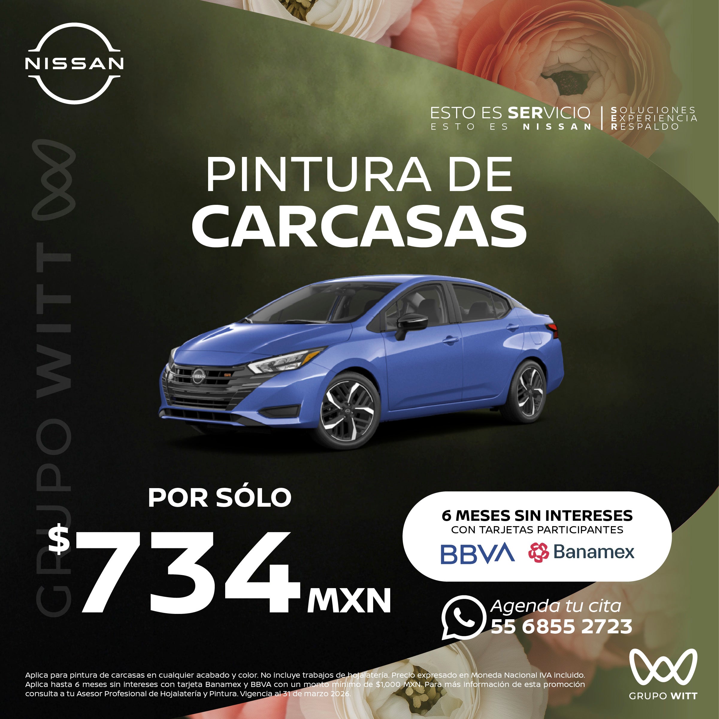 Aplica para pintura de carcasas en cualquier acabado y color. No incluye trabajos de hojalatería. Precio expresado en Moneda Nacional IVA incluido. Aplica hasta 6 meses sin intereses con tarjeta Banamex y BBVA con un monto mínimo de $1,000 MXN. Para más información de esta promoción consulta a tu Asesor Profesional de Hojalatería y Pintura. Vigencia al 31 de marzo 2026