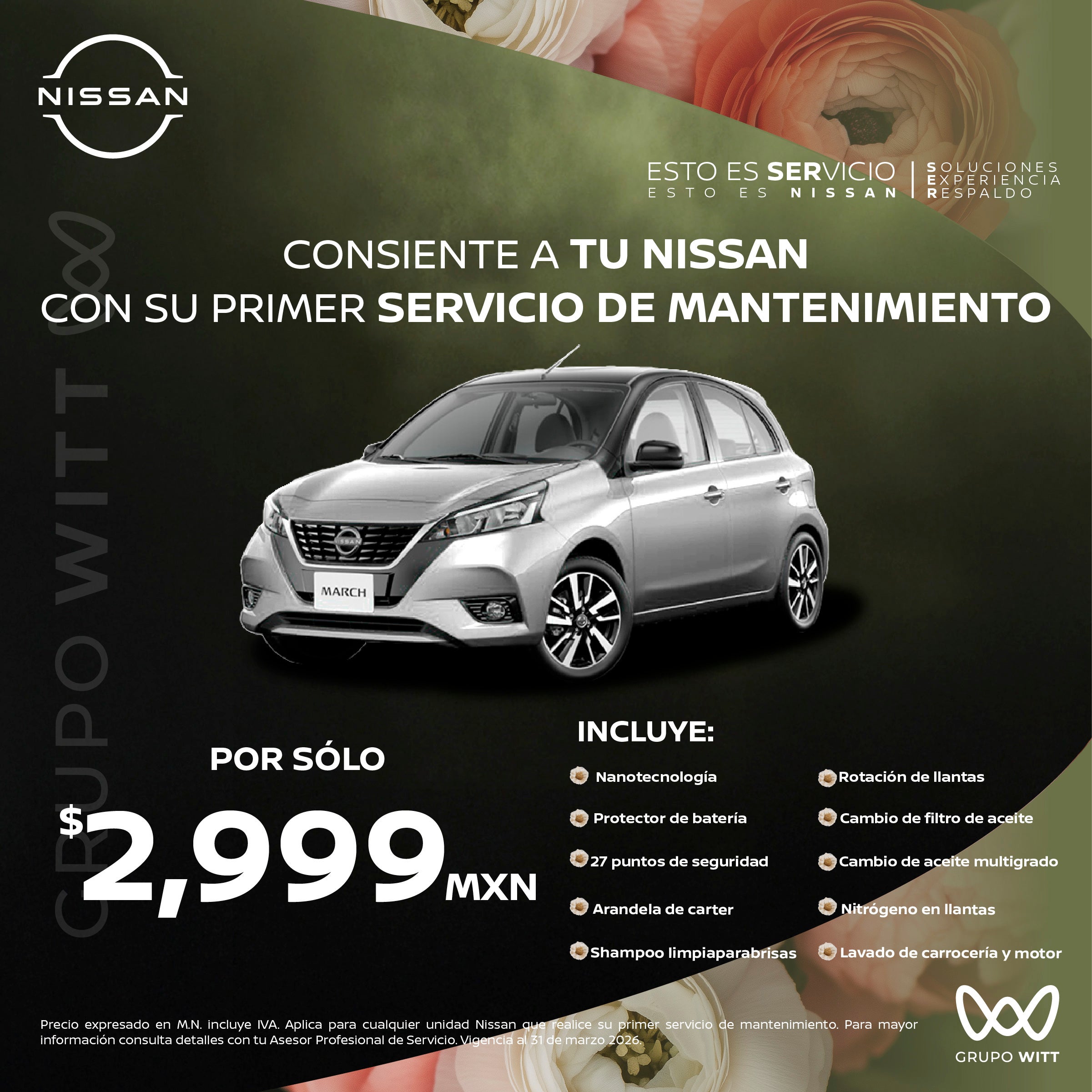 Precio expresado en M.N. incluye IVA. Aplica para cualquier unidad Nissan que realice su primer servicio de mantenimiento. Para mayor información consulta detalles con tu Asesor Profesional de Servicio. Vigencia al 31 de marzo 2026.