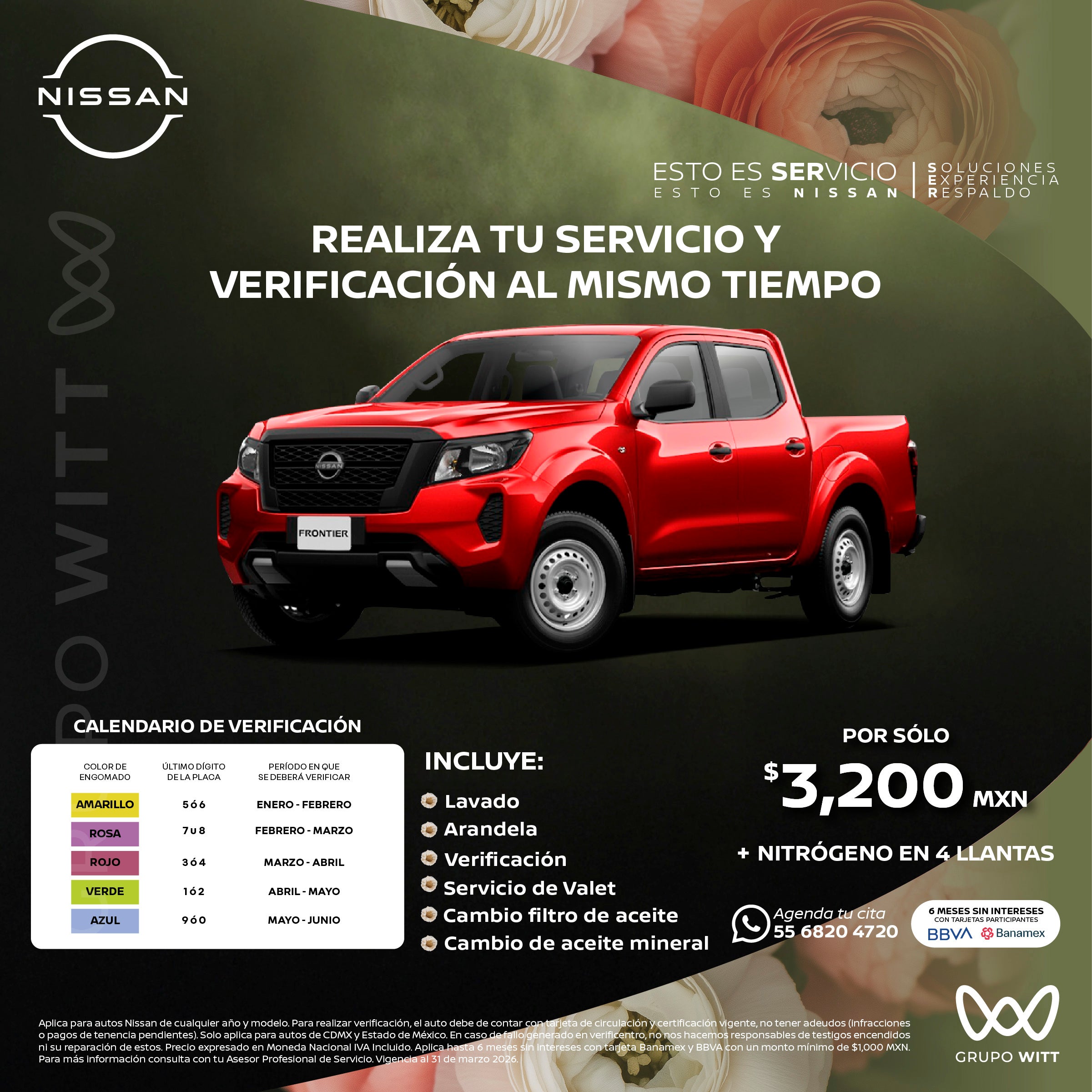 Aplica para autos Nissan de cualquier año y modelo. Para realizar verificación, el auto debe de contar con tarjeta de circulación y certificación vigente, no tener adeudos (Infracciones o pagos de tenencia pendientes). Solo aplica para autos de CDMX y Estado de México. En caso de fallo generado en verificentro, no nos hacemos responsables de testigos encendidos ni su reparación de estos. Precio expresado en Moneda Nacional IVA Incluido. Aplica hasta 6 meses sin Intereses con tarjeta Banamex y BBVA con un monto mínimo de $1,000 MXN. Para más Información consulta con tu Asesor Profesional de Servicio. Vigencia al 31 de marzo 2026.