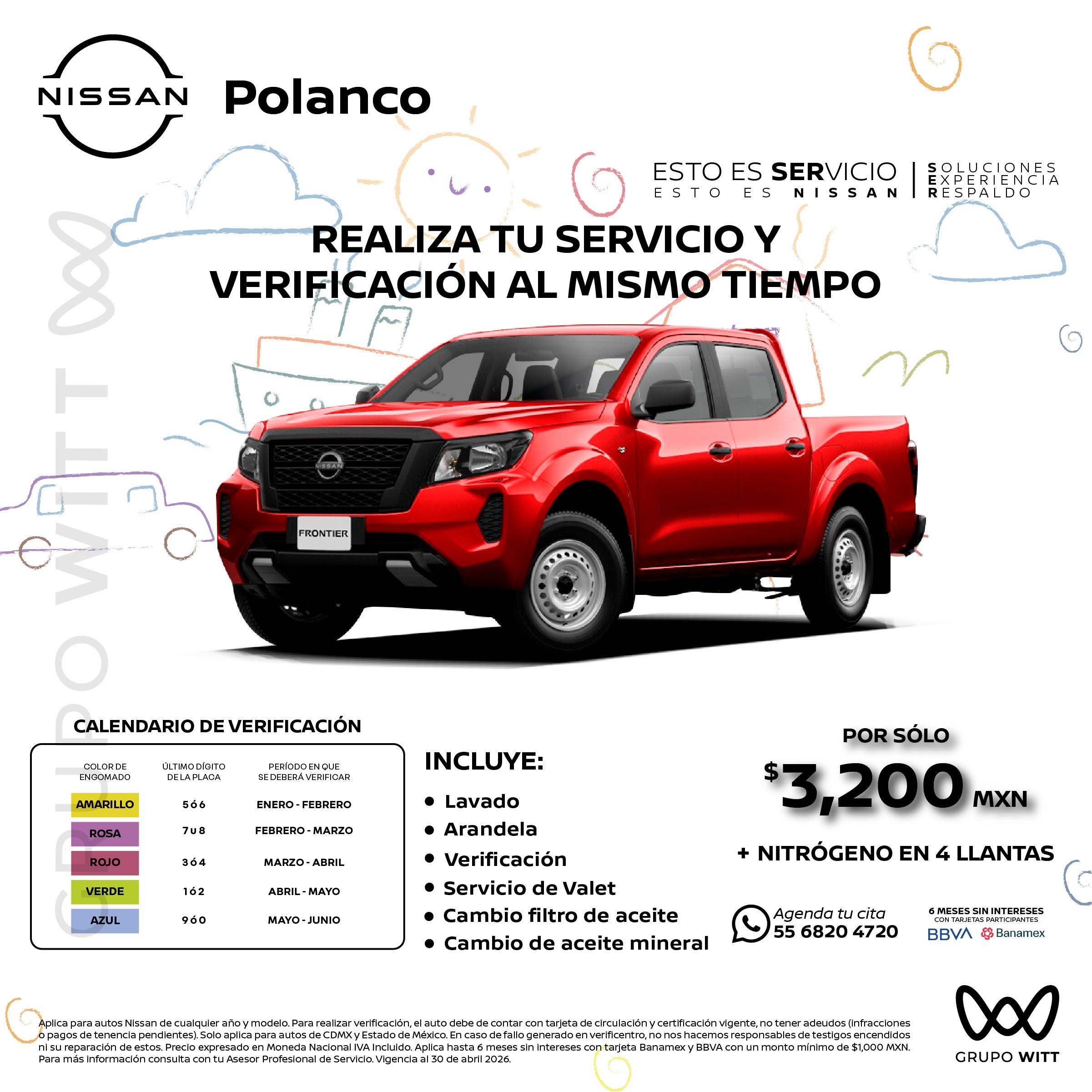 Aplica para autos Nissan de cualquier año y modelo. Para realizar verificación, el auto debe de contar con tarjeta de circulación y certificación vigente, no tener adeudos (infracciones o pagos de tenencia pendientes). Solo aplica para autos de CDMX y Estado de México. En caso de fallo generado en verificentro, no nos hacemos responsables de testigos encendidos ni su reparacion de estos. Precio expresado en Moneda Nacional IVA Incluido. Aplica hasta 6 meses sin intereses con tarjeta Banamex y BBVA con un monto mínimo de $1,000 MXN. Para más información consulta con tu Asesor Profesional de Servicio. Vigencia al 30 de abril 2026.