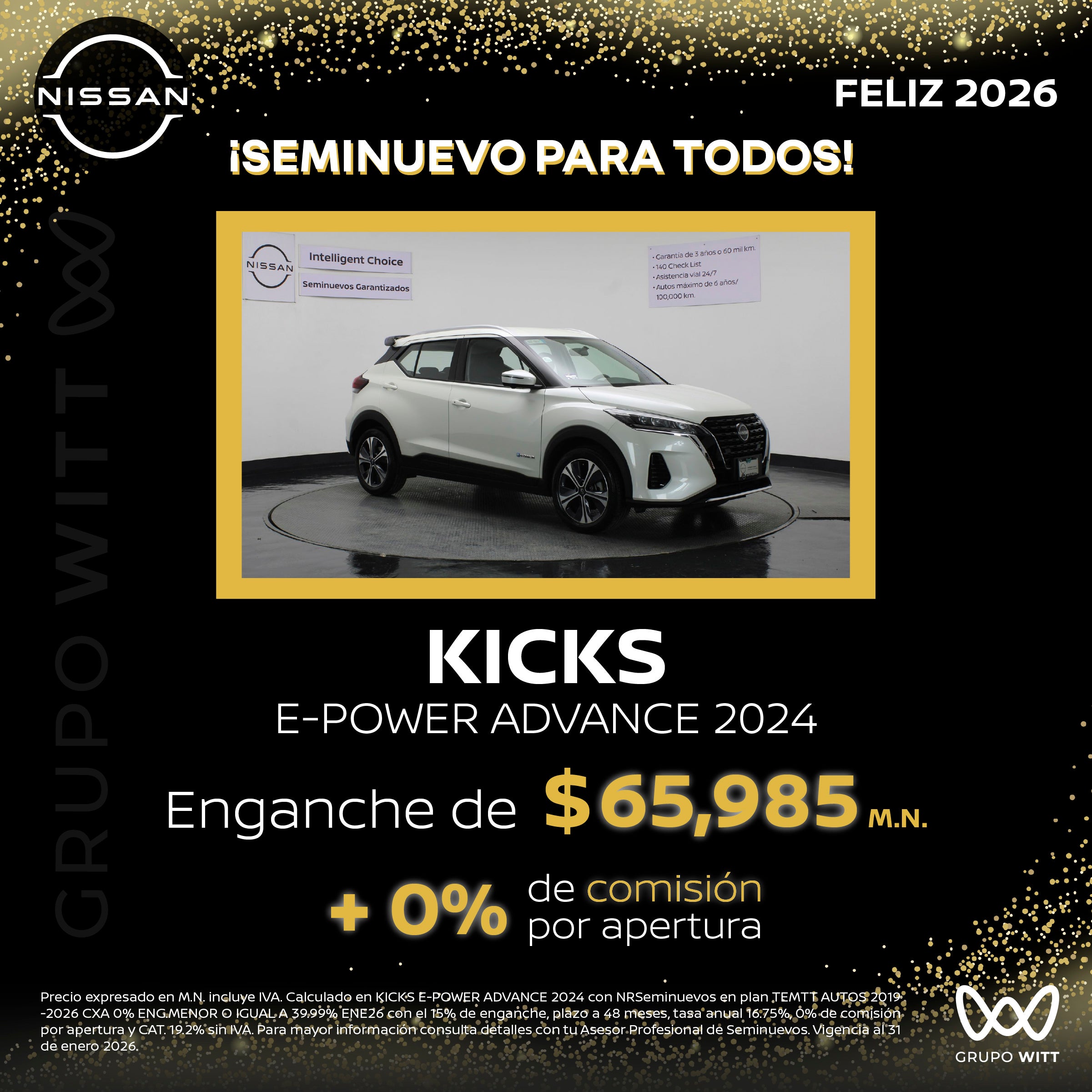 Precio expresado en M.N. incluye IVA. Calculado en KICKS E-POWER ADVANCE 2024 con NRSeminuevos en plan TEMTT AUTOS 2019. 2026 CXA 0% ENG.MENOR O IGUAL A 39.99% ENE26 con el 15% de enganche, plazo a 48 meses, tasa anual 16.75%, 0% de comisión por apertura y CAT. 19.2% sin IVA. Para mayor información consulta detalles con tu Asesor Profesional de Seminuevos. Vigencia al 31 de enero 2026.